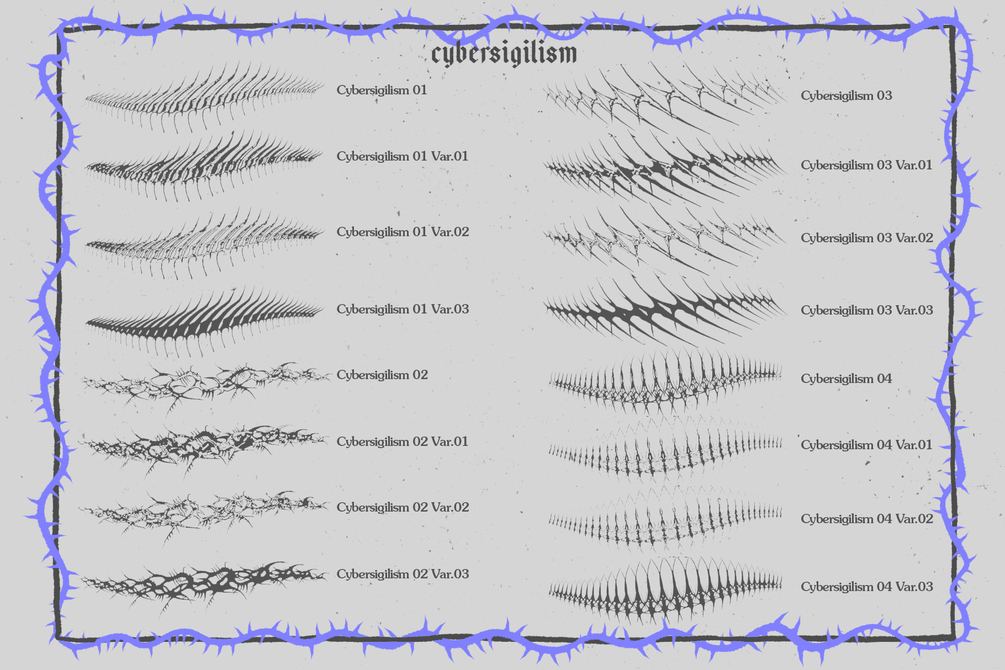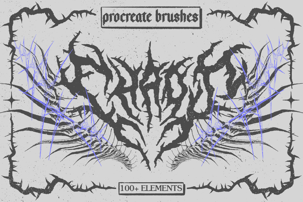 This extensive Procreate brushes collection, inspired by neo tribal, cybersigilism, dark lettering and metal logos aesthetics contains all the tools you need to create your own compositions.