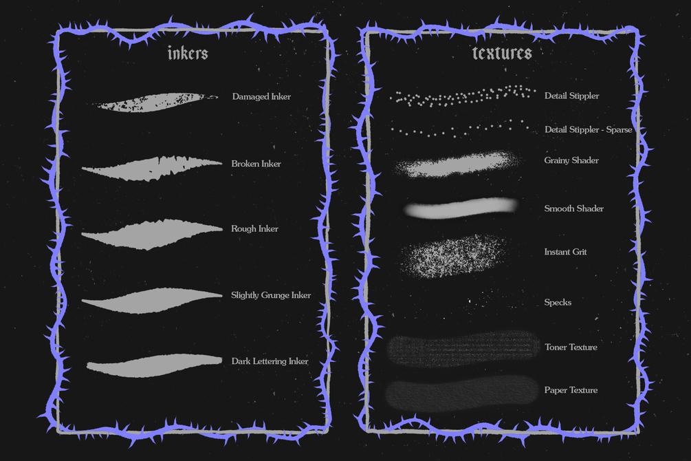 Textures: Includes shaders and overlays as well as stippling brushes to add details to your designs.