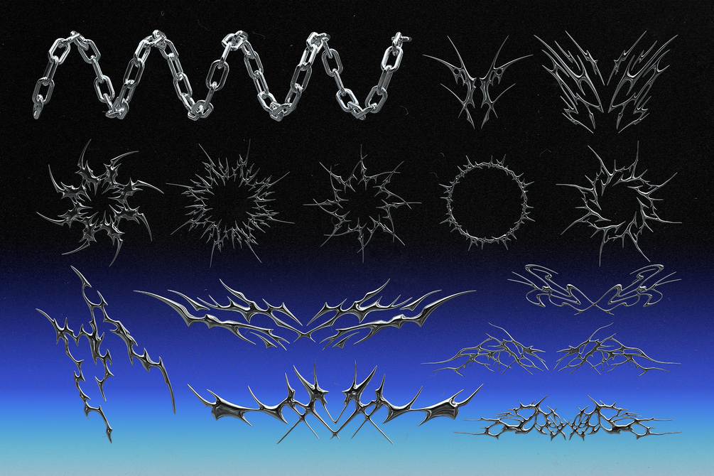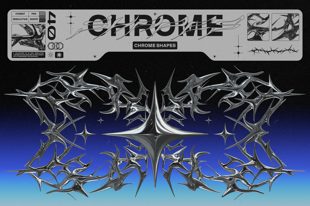 This set includes a collection of 40 PNG elements inspired by chrome style art.