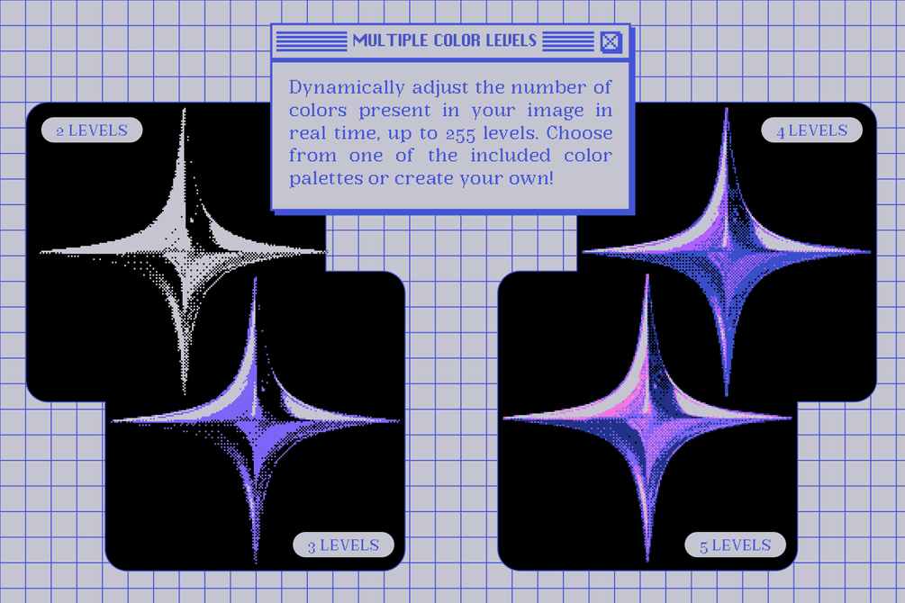 With 12 dithering patterns and 74 color palettes included, this tool offers almost endless possibilities for creating unique and visually interesting designs. Plus, you can see the results in real-time, making it easy to experiment and fine-tune your designs in a procedural way until you achieve the desired effect.
