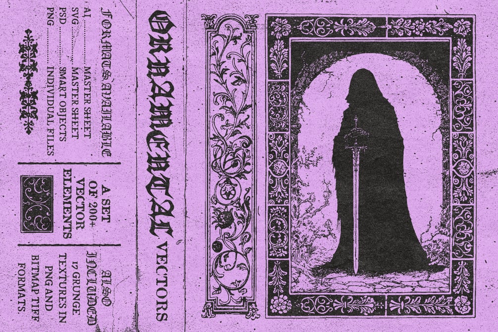 Bonus inside! Some of the images you see in the previews (guy with sword, cat and moth) are also included. There's also a seamless paper overlay, as well as a layered PSD example file that shows a bit how the previews were created by combining the vectors and grunge textures.