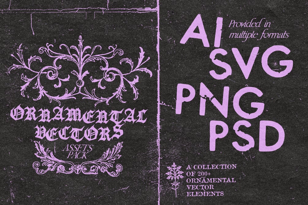 4 AI master sheets, 4 SVG master sheets, 1 PSD master sheet (4 artboards), 284 individual PNG elements, 17 grunge textures in PNG format, 17 grunge textures in TIFF format, Bonus paper overlay (Photoshop pattern + Seamless JPG textures), 3 Bonus images, in regular and inverted versions (PNG and TIFF formats), 1 PSD example file, and 1 Thank You PDF